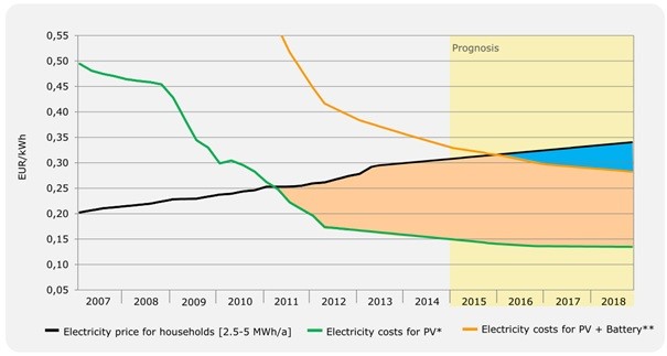 しかし、太陽光発電をめぐる状況にはポジティブなニュースも見受けられる。その1つが自家消費の経済性の向上である。2016年中、遅くとも2017年はじめには、太陽光発電+蓄電池のオプションの発電単価が家庭用電力小売価格を下回る蓄電パリティに到達するとみられる